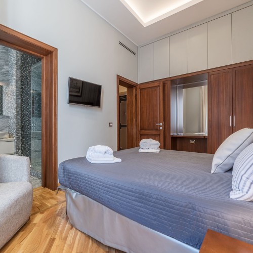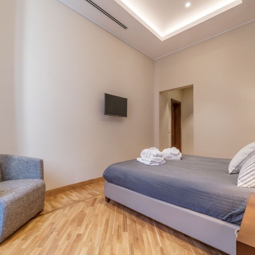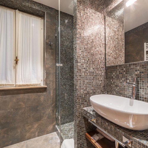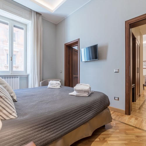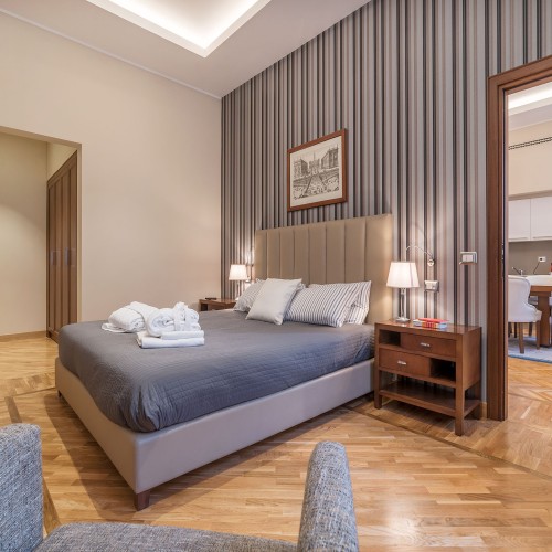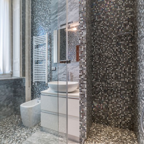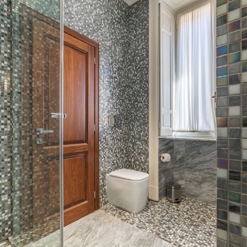 Con due luminose camere da letto matrimoniali eleganti e rivolte verso l'esterno in stile art déco di 89 mq, ciascuna dotata di lussuosi bagni privati decorati con piastrelle a mosaico e doccia a pioggia, questo appartamento si affaccia su Via Emilia, una strada tranquilla parallela a Via Veneto.