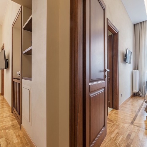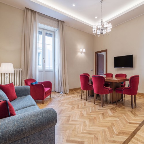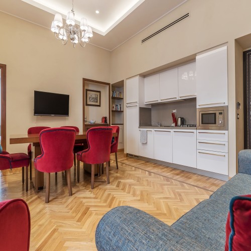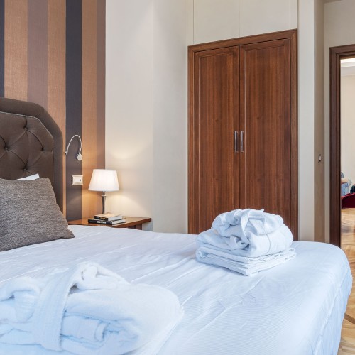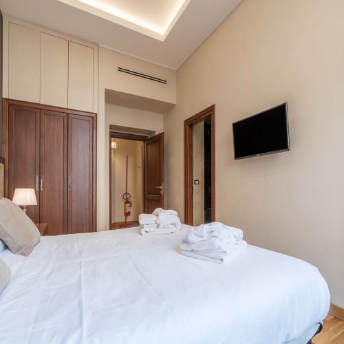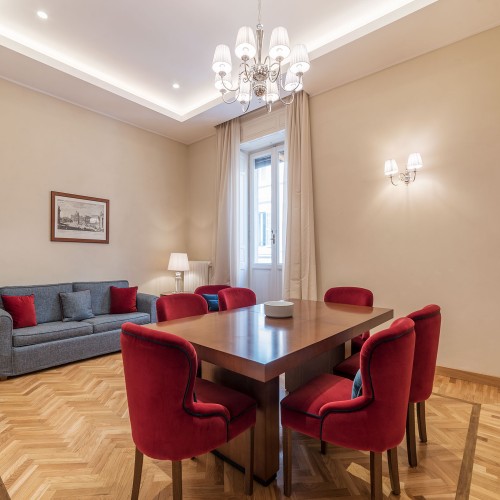 Con due luminose camere da letto matrimoniali eleganti e rivolte verso l'esterno di 80 mq in stile art deco, ciascuna dotata di lussuosi bagni privati decorati con piastrelle a mosaico e doccia a pioggia, questo appartamento a cinque stelle offre anche un accogliente balcone su Via Lazio, una tranquilla traversa -strada della rinomata Via Veneto. Il soggiorno con cucina completamente attrezzata, tavolo da sei posti e comodo divano letto.