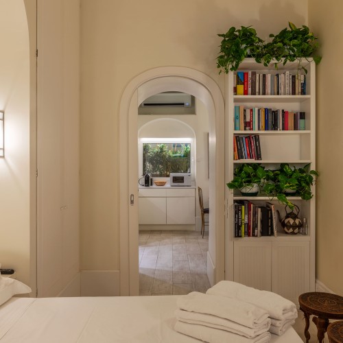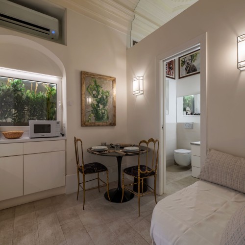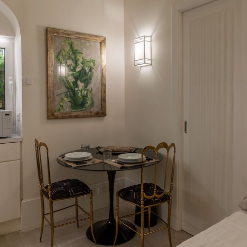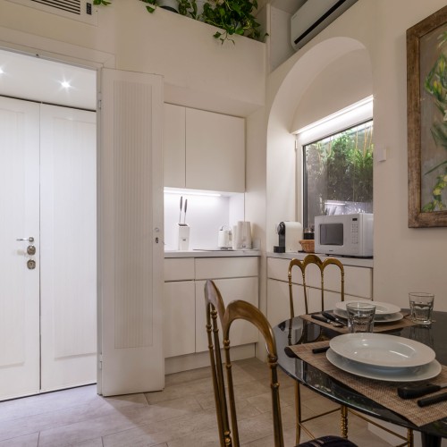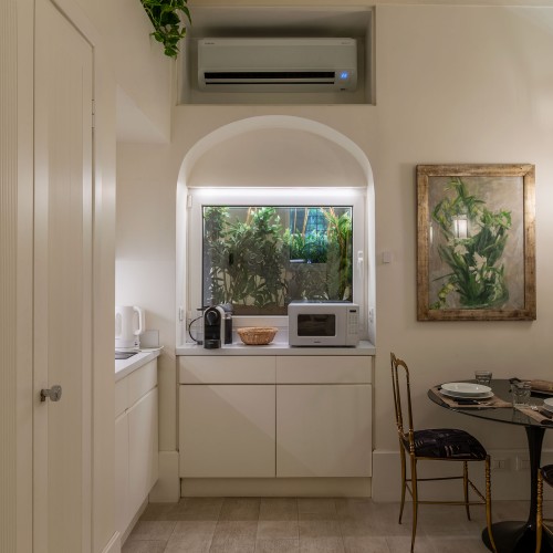 Il living, con cucinotto a vista, è raccolto e funzionale: lo spazio perfetto per rilassarsi dopo una giornata trascorsa tra le meraviglie della città.