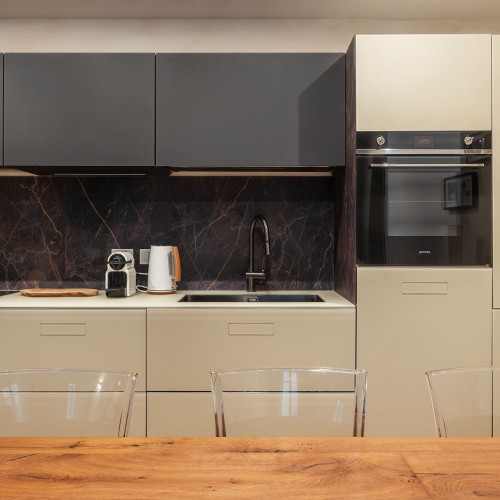 - Zona giorno open space: un ampio e luminoso ambiente composto da cucina a vista completamente attrezzata (piano a induzione, stoviglie, accessori), zona pranzo e area living, entrambe con affaccio su strada.