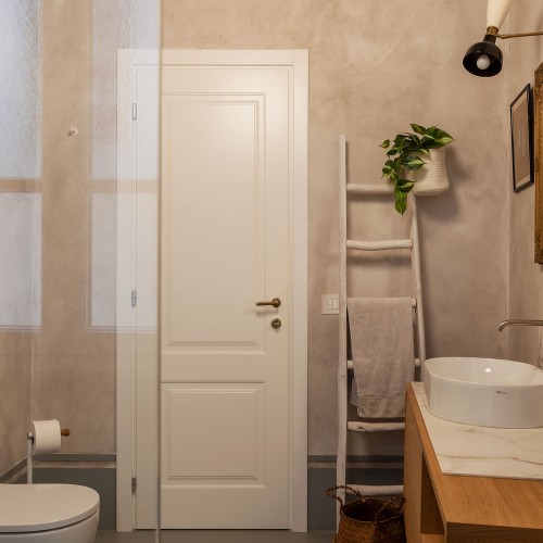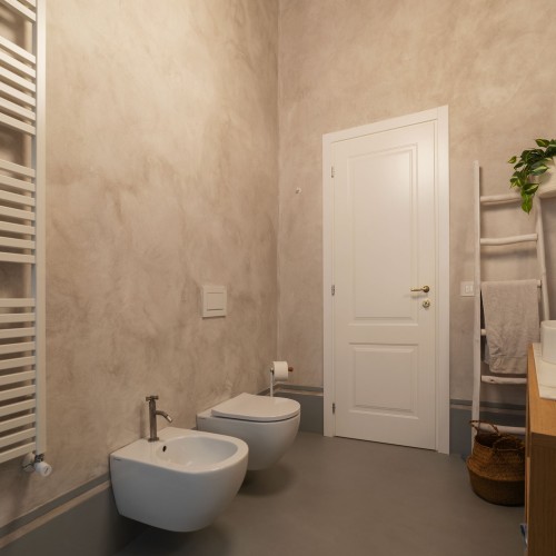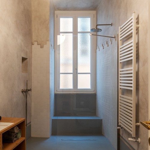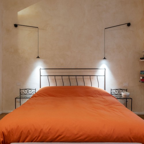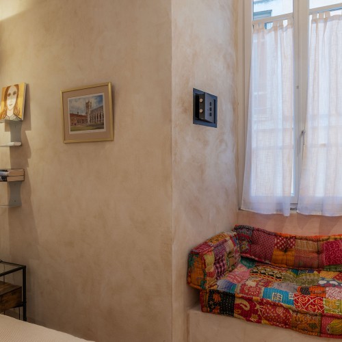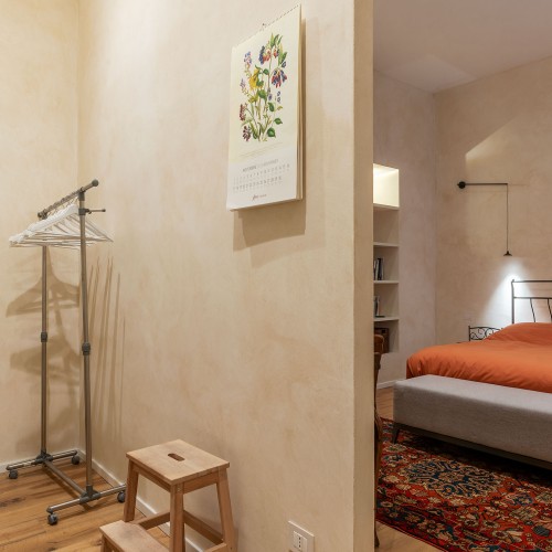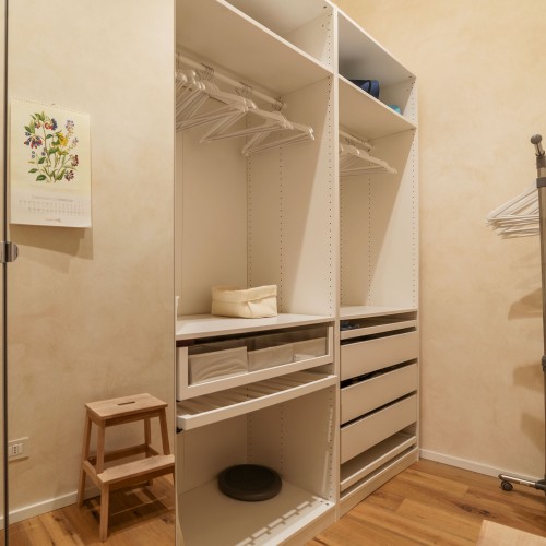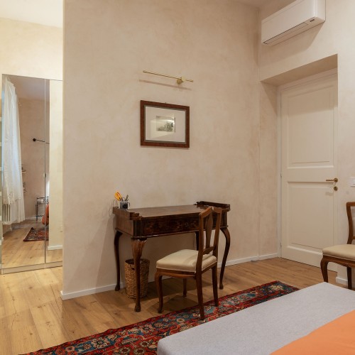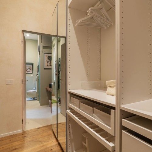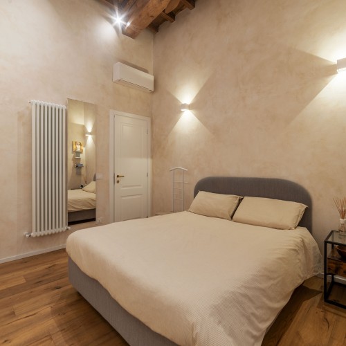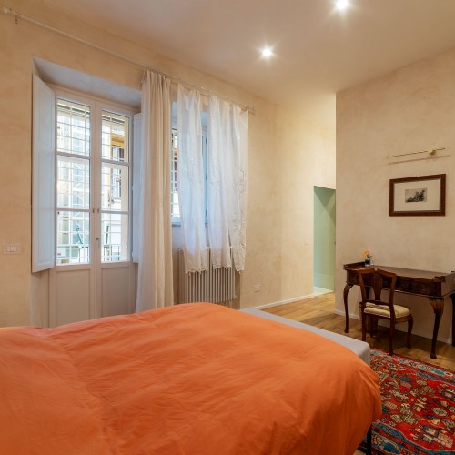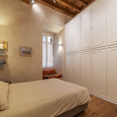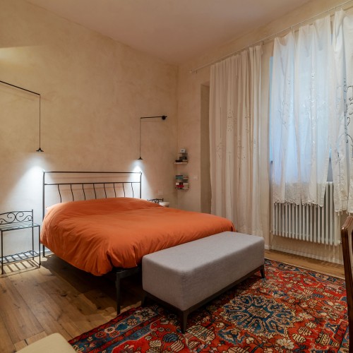 - La seconda, padronale, affaccia su una caratteristica chiostrina interna ed è impreziosita da un piccolo balconcino, una spaziosa cabina armadio e un elegante bagno en suite.