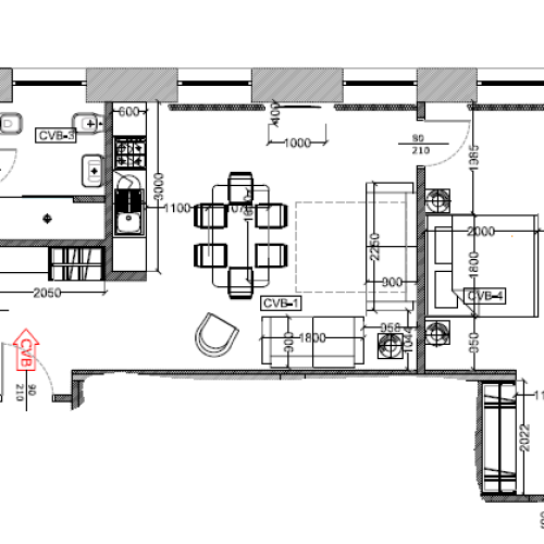 Il soggiorno con cucina completamente attrezzata, un tavolo a sei posti e un comodo divano letto.