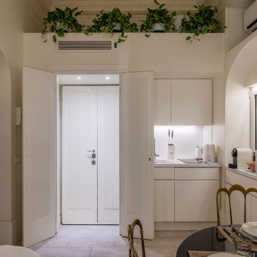 Il living, con cucinotto a vista, è raccolto e funzionale: lo spazio perfetto per rilassarsi dopo una giornata trascorsa tra le meraviglie della città.
