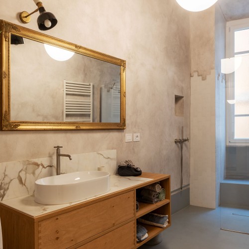 - La seconda, padronale, affaccia su una caratteristica chiostrina interna ed è impreziosita da un piccolo balconcino, una spaziosa cabina armadio e un elegante bagno en suite.